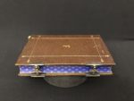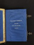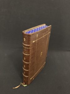 Maroquin havane, dos à 5 nerfs, auteur, titre, lieu et date dorés, fleurs de lys en fleurons, plats bordés par 4 filets dorés terminés par des fleurs de lys, au centre l'initiale frappée, filet doré aux coupes, dentelle intérieure, doublures et gardes de satin moiré bleu, tranches bleues décorées d'un semé de fleurs de lys ciselées et dorées, fermoirs ornés d'une fleur de lys [Dupuy] (infimes frott. ; mouill. très claire en début de vol., petite piq. de vers traversant le texte sans gravité sur le dernier tiers du vol.).