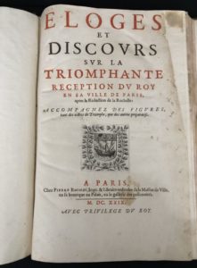 [Livre de fête]. — ÉLOGES et discours sur la triomphante réception du Roy en sa ville de Paris, après la réduction de La Rochelle... — Paris, chez Pierre Rocollet, 1629. — In-folio, [4] f., 180-11 p., pl.,
