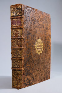 Veau hvane époque, dos à 6 nerfs, caissons ornés, pièce de titre maroquin brun, armes dorées aux plats, tranches dorées sur marbrure (défauts dont accrocs aux coiffes, couvrure très épidermée ; bruniss. et rouss. sans gravité ; petits accrocs ouo manque en marge de 5 f.).