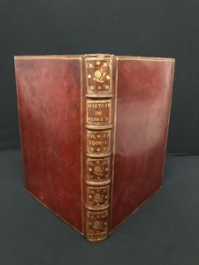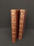 Maroquin rouge époque, dos à 5 nerfs, titre et tomaison dorés, caissons ornés de fleurons dorés et bordés d'un double filet doré, triple filet doré encadrant les plats, fleurons aux angles, double filet doré sur les coupes, tranches dorées sur marbrure, coiffes du t.2 restaurées (dos très légèrement passés, brunissures, dernier f. du t.2 sali).