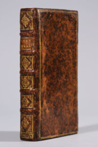 Veau havane moucheté et glacé époque, dos à 5 nerfs, pièce de titre fauve, caissons ornés, tranches jaspées, coins et coiffes restaurés avec filets ajoutés aux plats (défauts au dos, plats incurvés, mouillure étendue en début de vol. puis sporadique tache de cire p.197-199 et pl. en regard).