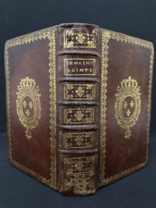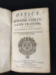 - OFFICE de la Semaine Sainte, latin-françois, à l'usage de Rome et Paris. Pour la Maison de Monseigneur le Duc d'Orléans… A Paris, chez d'Houry, 1736. Maroquin rouge, dos à 5 nerfs, caissons fleurdelisés, roulette dorée encadrants les plats, armes dorées au centre, roulette dorée aux coupes et chasses, tranches dorées.