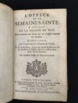 - OFFICE (L') de la Semaine-Sainte, à l'usage de la Maison du Roi… A Paris, de l'Impr. de J.-F. Collombat, 1748. Maroquin havane, dos à 5 nerfs, titre doré, caissons fleurdelisés, roulette dorée encadrant les plats, armes dorées au centre, roulette intérieure, tranches dorées (grossières restaurations des coiffes et coins).
