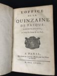 - OFFICE (L') de la quinzaine de Pasque, latin-françois, à l'usage de Rome et Paris.... A Paris, aux dépens des Libraires associés, 1739. Fort in-8, maroquin rouge, dos à 5 nerfs, titre doré, caissons fleurdelisés, bordés d'un double filet doré, roulette dorée encadrant les plats, armes dorées au centre, roulette dorée sur les coupes et chasses, tranches dorées (restauration malhabile de 2 coins).