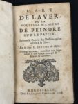 G 1171 / 40. GAUTIER (Henri). L'art de laver, ou La nouvelle manière de prendre sur le papier... A Brusselle, chez F. Foppens, 1708. Petit in-8, [4] f., 120 p., 1 planche gravée sur cuivre par Harrewyn, veau havane époque, dos à 5 nerfs, tranches rouges (reliure usée, rousseurs et brunissures).