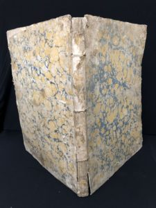 Cartonnage marbré modeste de l'époque (lacunes au dos, coupes et coins usés, plats frottés ; mouillure angulaire aux 15 premiers et 15 derniers f.).
