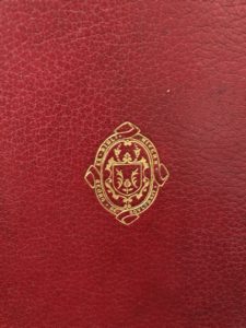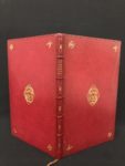 Maroquin rouge XIXe s., dos à 5 nerfs, titre doré, caissons ornés de fleurons dorés et bordés d'un double filet à froid, plats encadré d'un double filet à froid, le chiffre et la pièce d'armes du possesseur dorés aux angles, médaillons aux armes doré au centre, filet doré sur les coupes, dentelle intérieure, tranches dorées (petite tache claire au bord du plat sup., au plat sup., accroc sans manque sur une coupe de queue, petit manque en marge p. 55).
