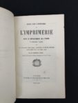 Edition originale de cet ouvrage dont la seconde partie renferme un Catalogue des livres, brochures et pièces imprimés à Auxerre de 1580 à 1857, et qui forme tome X, 2e partie, du Bulletin des sciences historiques et naturelles de l'Yonne. Elle est illustrée de deux planches lithographiées par A. Ramard et Perriquet à Auxerre montrant un spécimen de 2 pages du livre imprimé à Chablis par Pierre Le Rouge en 1478, et les marques des imprimeurs Pierre Le Rouge et Jean Savine.