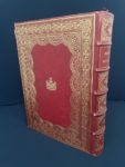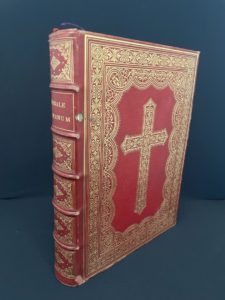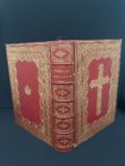Chagrin rouge richement orné, motif d'une croix au plat supérieur, armes au plat inférieur, le tout doré, tranches dorées, 9 onglets de satin rouge, 8 signets de satin de couleurs multples (menus défauts dont accroc le long d'un mors).