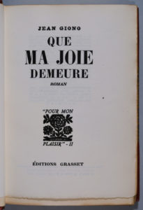 GIONO (Jean).— Que ma joie demeure. — Paris, Grasset, (Pour mon plaisir), 1935. — In-12, 493 p.,