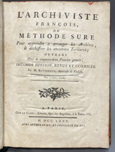 BATTENEY (Joseph). — L'Archiviste françois, ou méthode sûre pour apprendre à arranger les Archives & déchiffrer les anciennes Écritures. — Paris, Le Clerc, 1775. — In-4, veau marbré, dos orné, pièce rouge, tranches rouges (Reliure de...