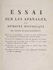 DU VAUCEL (Louis-François)]. — Essai sur les apanages, ou Mémoire historique de leur établissement. — S.l.n.d.[vers 1788]. — 3 parties en un volume in-4, veau marbré, triple filet doré, dos orné, pièce de titre rouge, roulette...