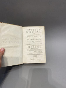 [HOLBACH (Baron d')]. — Système social, ou Principes naturels de la morale et de la politique. — Avec un Examen de l'influence du gouvernement sur les mœurs. — Londres, s.n., 1773. — 3 volumes in-8, demi-basane mouchetée avec coins, dos...