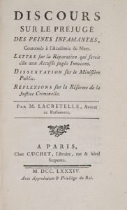 LACRETELLE (Pierre-Louis). — Discours sur le préjugé des peines infamantes, couronnés à l'Académie de Metz […]. — Paris, Cuchet, 1784. — In-8, veau marbré, filet à froid, dos lisse orné, pièce de titre rouge, tranches rouges (Reliure...