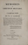 LARREY (Jean-Dominique, baron). — Mémoires de chirurgie militaire, et campagnes. — Paris, Smith, Buisson, Imprimerie de Stône, 1812-1817. — 4 volumes. - Recueil de mémoire de chirurgie. Paris, Compère jeune, 1821. — Un volume. - Relation...