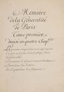 Copie manuscrite du XVIIIe siècle du Mémoire de la généralité de Paris établi par Pierre Rolland de Parthenay (mort en 1711), trésorier de France au bureau des finances de Paris, pour l'instruction du Duc de Bourgogne (1682-1712), petit-fils du Roi-Soleil.