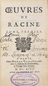 RACINE. — Œuvre. — Paris, Pierre Trabouillet, 1697. — 2 volumes in-12, veau brun, dos orné, pièce fauve, tranches mouchetées de rouge (Reliure de l'époque).