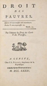 REYMOND (l'abbé Henri)]. — Du Droit des pauvres. — Genève, Pellet, 1781. — In-8, basane marbrée, filet à froid, dos orné, pièce de titre rouge, tranches rouges (Reliure de l'époque).