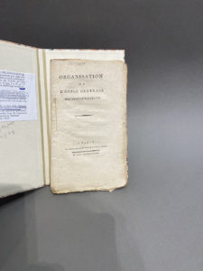 ÉCOLE POLYTECHNIQUE. - Organisation de l'École centrale des travaux publics. — Paris, De l'Imprimerie du Comité de Salut public, An III de la République française. — Plaquette in-12, un feuillet de titre et 31 pages, brochée, emboîtage de...