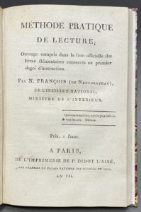 FRANÇOIS (de Neufchateau). — Méthode pratique de lecture ; ouvrage compris dans la liste officielle des livres élémentaires consacrés au premier degré d'instruction. — Paris, P. Didot l'aîné, an VII (1799). — In-8, bradel demi-maroquin...