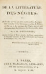 Édition originale de la première étude de la littérature des Noirs auxquels Grégoire prête les mêmes capacités intellectuelles que les Blancs.