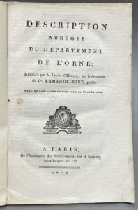 LAMAGDELEINE. — Description abrégée du département de l'Orne ; rédigée par le Lycée d'Alençon, sur la demande du citoyen Lamagdeleine, préfet. — Paris, De l'Imprimerie des Sourds-Muets, An IX. — Plaquette in-12, brochée, couverture...