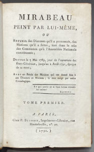MIRABEAU. — Mirabeau peint par lui-même, recueil des discours qu'il a prononcés, des motions qu'il a faites tant dans le sein des communes qu'à l'Assemblée nationale constituante. — Paris, Buisson, 1791. — 4 volumes in-8, demi-basane avec...