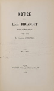 ASSELINEAU (Charles). — Notice sur Lazare Bruandet, peintre de l'école française (1753-1803). — Paris, Dumoulin [à la fin : Alençon, Poulet-Malassis et De Broise], 1855. — Plaquette in-8 de 20 pages, demi-chagrin aubergine, dos lisse orné...