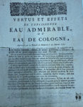 EAU DE COLOGNE. - Vertus et effets de l'excellente eau admirable ou eau de Cologne. — Approuvé par la Faculté de médecine. — 3 janvier 1731. — 4 pages in-4, en feuilles, et une feuille in-folio portant sur une page la publicité pour l'eau...
