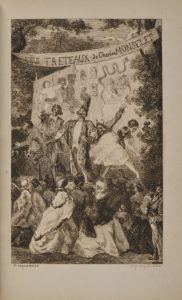 MONSELET (Charles). — Les Tréteaux, avec un frontispice dessiné et gravé par Bracquemond. — Paris, Poulet-Malassis et Debroise, 1859. — In-12, demi-maroquin rouge avec coins, tête dorée, couverture (Loiselier).