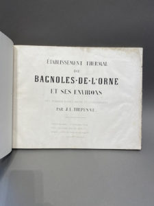 TIRPENNE (Jean-Louis). — Établissement thermal de Bagnoles-de-l'Orne et ses environs. — Bagnoles-de-l'Orne, à l'établissement ; Paris, Penaud-Joly, Alençon, Veillon,s.d. (vers 1850). — In-folio oblong, bradel demi-toile noire (Reliure moderne).