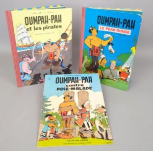 OUMPAH-PAH - Goscinny et Uderzo - 3 albums: Oumpah-pah le peau rouge. 1961. EO. En état moyen (coins usés, déreliés). Oumpah-pah et les pirates. 1962. EO belge. Bon état. Oumpah-pah contre foie-malade. Broché, 1977 (2ème édition). Rousseurs.