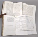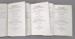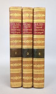 SAY (Jean-Baptiste): Traité d'économie politique, ou simple exposition de la manière dont se forment, se distribuent, et se consomment les richesses. Cinquième édition, augmentée d'un volume et à laquelle se trouvent joints un épitome des principes fondamentaux de l'économie politique, et un index raisonné des matières. Paris, Rapilly, 1826. 3 volumes. 12 par 20 cm. (4)-CVIII-385 ; (4)-III-(1)-408; (4)-435 pages + 1 tableau dépliant. h.t. Pleine basane racinée de l'époque, dos lisses ornés, pièces de titre rouges. Petits manques de cuir sur 1 plat et 1 charnière. Rousseurs éparses. 5 édition (E.O 1803) C'est une "erreur fondamentale qui vicie l'appréciation de la place de Say dans l'histoire de l'économie, à savoir, l'interprétation courante de son rapport à A. Smith. L'oeuvre de Say poursuit la tradition Cantillon-Turgot. Le plus important de son oeuvre est sa grande contribution à l'économie analytique, et sa conception de l'équilibre économique, bien qu'elle soit formulée de façon vague et imparfaite. L'oeuvre de Say est le maillon le plus important de la chaîne qui nous conduit de Cantillon et Turgot à Walras." (Schumpeter).