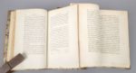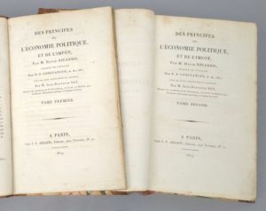 RICARDO (David): Des principes de l'économie politique et de l'impôt. Traduit de l'anglais par F.-S. Constancio ; avec des notes explicatives et critiques, par M. Jean-Baptiste Say. Paris, J.P. Aillaud, 1819. 2 volumes. 13 par 21,2 cm. X-(2)-431; VI-375 pages. Demi-veau de l'époque, dos ornés à froid, têtes dorées, pièces de titre noires. Restauration anciennes des charnières. Papier parfois légèrement roussi. Edition originale en français, rare. (E.O. en anglais : 1817). Peut-être le livre le plus puissant de toute l'histoire des doctrines économiques". "Père fondateur au côté d'Adam Smith, de l'approche classique, David Ricardo (1772-1823) propose dans On the principles of political economy and taxation, une analyse du capitalisme naissant qui a orienté l'ensemble de l'économie politique au XIXe siècle. Les Principes marquent tout d'abord l'avènement d'une théorie économique déductive, fondée sur la formulation d'hypothèses et d'axiomes et la mise au jour de leurs conséquences logiques." (Encycl. Universalis).