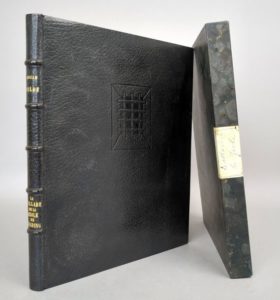 WILDE (Oscar): la ballade de la geôle de Reading. Compositions de G. Cornélius. Paris, Javal et Bourdeaux, 1927. Un volume. 22,5 par 28,5 cm. 28-XLIX pages. Plein maroquin noir, avec sur chaque plat un décor à froid représentant une fenêtre de prison, dos 5 nerfs, large encadrement intérieur avec deux filets à froid, couvertures et dos illustrés conservés, tête dorée, étui doublé e bordé. Reliure signée René KIEFFER. Parfait état de l'exemplaire (une malencontreuse étiquette sur le dos de l'étui). 15 compositions de Cornelius gravées sur cuivre en couleurs par Thévenin dont 9 hors texte. Tirage limité à 225 exemplaires, tous identiques sur papier impérial du Japon. (175). Une illustration symbolique et mystique de ce texte poignant.