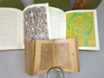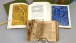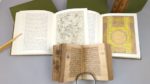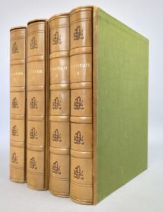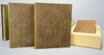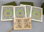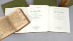 [CORAN] Le Coran traduit de l'arabe par Jean Grosjean illustré de sérigraphies originales par Zenderoudi accompagné du manuscrit d'Ibn al-Bawwab commenté par D. S. Rice. Paris, Club du Livre, Philippe Lebaud, 1972. 3 volumes. 21,5 par 26 cm. 2 volumes pleine basane havane avec un décor arabisant à froid, tête dorée, gardes en soie, sous étui en toile verte d'éditeur. Un emboitage imitant un ensemble de deux volumes, contenant un fac-similé du manuscrit du Coran de Ibn Al-Bawwab, en pleine basane dos 3 nerfs, caissons décorés à froid, plats décorés d'un motif arabisant à froid. Et une étude sur ce manuscrit dans une pleine percaline verte. Quelques frottements sur les dos, comme souvent, sans gravité. Excellent état intérieur. Exemplaire numéroté sur vélin de Lana (2022). Très belle qualité du fac-similé. Belles sérigraphies hors texte couleurs et or par Charles Hossein Zenderoudi. Une des rares éditions modernes du CORAN qui soit à la fois sérieuse et élégante.