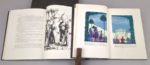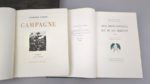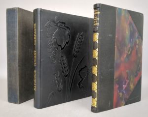 REGNIER (Henri de): Les rencontres de M. de Bréot. Illustrations de Robert BONFILS. Paris, René KIEFFER, 1919. Un volume. 19,5 par 29 cm. (4)-II-187 pages. Demi-maroquin noir à coins d'époque, dos superbement décoré de motifs en relief et à l'or, tête dorée, couvertures et dos conservés. Reliure signée René KIEFFER. Quelques frottements superficiels sur la reliure, un petit choc sans gravité en bas du 2ème plat. Sinon très bon exemplaire. Exemplaire sur vélin de cuve (N°266), sur un tirage total de 560 ex. Le début déjà brillant des éditions réalisées par René KIEFFER… Avec VINCENT (Raymonde: Campagne. Lithographies de Charles BOULEAU. Paris, Stock, 1943. 22 par 28 cm. 265 pages. Plein chagrin noir dos lisse, plats décorés de motifs en épis de blés et en feuilles en reliefs, d'une très grande qualité. Couvertures et dos conservés, gardes en papier de motif cachemire, dans son étui bordé. Excellent état de l'exemplaire. Tirage limité à 290 ex. Ici le n°198, sur vergé d'Arches. Avec 27 lithographies de Charles BOULEAU. Cette reliure d'une grande dextérité n'est curieusement pas signée.