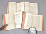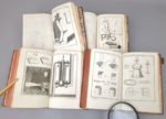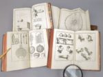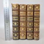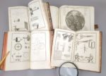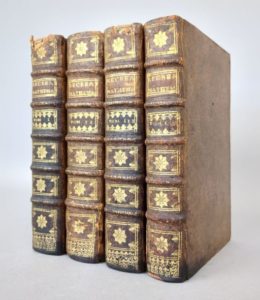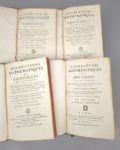 OZANAM (Jacques): Récréations mathématiques et physiques qui contiennent plusieurs problèmes d'arithmétique, (…), de musique, d'optique, de gnomonique, (…) Avec un Traité des horloges élémentaires. Nouvelle édition revûe, corrigée & augmentée. Paris, Jombert, 1735. 4 volumes. 12 par 19,5 cm. (16)-460-(20) et 32 planches; (4)-462-(14) et 56 planches; (2)-482-(12) et 31 planches; (8)-446-(6) et 17 planches (complet). Plein veau brun moucheté de l'époque dos 5 nerfs, caissons ornés. Petits manques de cuir sur deux dos et une coiffe, petits défauts superficiels sur les plats, sans gravité. Très bon état intérieur (papiers de gardes manquants dans le tome 1). L'exemplaire est bien complet de ses 136 planches. L'ouvrage apporte une approche ludique des mathématiques à travers nombre de problèmes distrayants et techniques nouvelles de calcul tels la « multiplication par les doigts ». Cette édition est considérée comme la plus pertinente parue jusqu'alors et comporte un traité des horloges élémentaires de Domenico Martinelli, une longue dissertation sur les lampes perpétuelles et surtout des «tours de gibecière» (tours de prestidigitation).(Wikipédia)