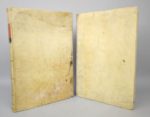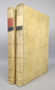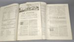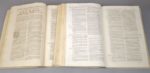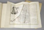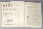 BIBLE. La Sainte Bible qui contient le Vieux testament, Revue & corrigée sur le texte hébreu & grec, par les Pasteurs & les Professeurs de l'Eglise de Geneve. Avec les argumens et les réflexions sur les chapitres de l'écriture sainte, et des notes par J. F. Ostervald… Cinquième édition, soigneusement revue & corrigée. [Suivi de] Le Nouveau Testament, c'est-à-dire, la nouvelle alliance de notre seigneur Jésus-Christ, Revu & corrigé sur le texte grec… Neuchatel, Imprimerie de la Société Typographique, 1779. 2 volumes. 26 par 40 cm. Frontispice-portrait-VIII-682 pages plus une carte dépliante en couleurs; (2)-326-(2)-337 à 671 pages. Plein vélin blanc d'époque. Quelques petites tâches sans gravité, perte d'une pièce de titre, sinon très bon état de la reliure. Quelques feuillets légèrement roussis, restaurations anciennes sans manque sur la page de titre du tome 1, petite mouillure marginale claire sur une dizaine de feuillets, sinon très bon état. La pagination passe de 326 à 337, sans manque. Nouvelle édition de cette célèbre Bible révisée par Jean-Frédéric Ostervald d'après la traduction de la Bible d'Olivétan donnée par David Martin. Ostervald termina sa version en 1744 et devint la Bible la plus utilisée dans les églises protestantes jusqu'à la fin du dix-neuvième siècle. Son intérêt réside dans les commentaires et les réflexions qu'Ostervald a ajoutés. L'édition est illustrée d'un frontispice sur cuivre par Billé d'après Le Barbier, d'un portrait d'Ostervald gravé sur cuivre d'après Henchoz, d'une vignette située en tête de la Genèse et d'une grande carte en couleurs. Ces deux compositions de Le Barbier sont en premier tirage, datées chacune de 1778. La carte repliée en couleurs des douze tribus d'Israël, par Bonne, est extraite d'un Atlas publié à Paris chez Lattré. Le Nouveau Testament a un titre propre mais une pagination continue, contrairement aux éditions précédentes. Edition rare de cette Bible protestante réputée.