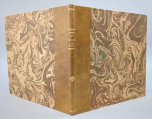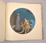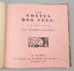 PERRAULT (Charles): Contes des fées, illustrés par Lucien LAFORGE. La Belle au bois dormant ; Le Petit Chaperon rouge; La Barbe-Bleue ; Le Chat Botté ; Les Fées ; Cendrillon; Riquet à la Houppe ; Le Petit Poucet. Paris, la Sirène, 1920. Un volume. 23,5 par 23,5 cm. Non paginé. 8 hors-textes coloriés au pochoir, et de nombreuses illustrations en noir dans le texte. Demi-chagrin cuivre d'époque, dos lisse orné, 1er plat de la couverture conservé. Exemplaire en parfait état. Lucien LAFORGE (1889-1952), artiste de presse (La Charrette Charrie, la Baillonnette.) et illustrateur (l'Abecédaire, Les Mille et Une Nuits.) est aussi un peintre reconnu dans le Salon de l'Araignée créé par Gus BOFA. Une merveilleuse illustration des contes de Perrault.
