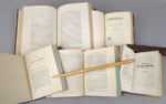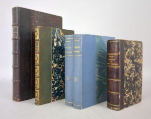 Réunion de 4 ouvrages 19ème sur le Paris curieux, en 5 volumes reliés: 1. TOURNEUX (Maurice): Paris au XVIIIe siècle. Les promenades à la mode. Eau-forte par Ad. Lalauze. Paris, Librairie des Bibliophiles, 1888. Un volume. 10,5 par 17,5 cm. 1 frontispice gravé-(4)-XV-(1)-112-(3) pages. Demi-maroquin glauque (c'est une couleur) de l'époque à coins, dos à nerfs orné, plats de la couverture conservés, tête dorée. Reliure signée Pierson. "Tiré à très petit nombre". Edition collective de pièces légères relatives aux moeurs parisiennes au XVIIIe siècle 2. BRAZIER (Nicolas): Histoire des petits théâtres de Paris depuis leur origine. Nouvelle édition, corrigée et augmentée de plusieurs chroniques. Paris, Allardin, 1838, 2 tomes en 1 volume. 8,5 par 14,2 cm. XVI-303-(1); (4)-264 pages. Demi-basane brune de l'époque. Quelques frottements, quelques rousseurs éparses. Pp. [247] à 264 du tome 2 : Catalogue des pièces de théâtre que Brazier a fait représenter à Paris, depuis l'année 1803 jusqu'en 1838, avec les noms de ses collaborateurs. 2e édition (E.O. : 1837). Laporte, Biblio. contemporaine II-6. "2e édition plus recherchée que la 1ère, elle est augmentée de quelques aventures assez lestes." (Laporte). 3. PRIVAT D'ANGLEMONT (Alexandre): 1) Paris anecdote. Paris, A. Delahays, s.d., 243 pp. ; 2) Paris inconnu. Précédé d'une étude sur sa vie par M. Alfred Delvau. Paris, Adolphe Delahays,1875, (4)-315 pp. + 1 portrait h.t. ; soit 2 ouvrages en 1 volume. 12 par 15,5 cm. Demi-percaline bleu ciel de l'époque, à coins, plats de la couverture conservés pour le second volume. Très bon état des deux tomes. Privat d'Anglemont, journaliste bohême, "a consacré nombre d'articles au Paris des petits métiers, des industries rares [...], parus dans les journaux, en particulier dans Le Siècle et réunis dans deux recueils : Paris anecdote (1854) et Paris inconnu (1861) [...]. Privat d'Anglemont explore Paris la nuit avec le même esprit d'aventure, le même appétit de découverte qu'on pourrait éprouver pour les pays plus lointains." (Jean-Pierre A. Bernard, Les deux Paris, les représentations de Paris dans la seconde moitié du XIXe siècle, pp. 200-201). 4. VEUILLOT (Louis): Les odeurs de Paris. Paris, Palmé, 1867. Un volume. 13,5 par 22,5 cm. , in-8 de XVI-498 pp. + 1 f. n.ch. (prospectus pour 2 ouvrages). Demi-chagrin brun de l'époque, dos 5 nerfs. Tout petits frottements, quelques rousseurs discrètes. Edition originale. P. Lacombe, n° 1144 ; Van Tieghem, p. 4071. «Véritable édition originale (et seule édition de ce format) de cet ouvrage célèbre qui fit comme on se le rappelle encore, tant de bruit dans Paris lors de son apparition. Les deux premiers livres consacrés à la presse, le troisième consacré aux divertissements parisiens (théâtres, cafés-concerts, etc.) suscitèrent les plus vives réclamations dans le monde et dans les journaux à cause des violences qu'il contenait [...]. Louis Veuillot a souvent peint ses personnages sous des noms supposés. On trouve Passionnard d'Auvergne (Jules Vallès), Eliassin Lupus (Albert Wolff), Amanda Pigeonnier (Marie Colombier), Passe-Partout (Adrien Marx), Lilia (George Sand) [...].» Un condensé de méchanceté érudite et réactionnaire…