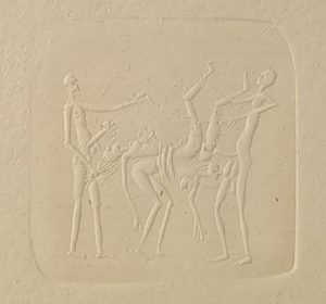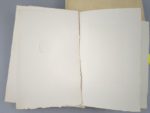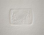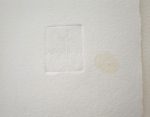 [curiosa] [SOLIER (René de)]: La Grappe, ou l'instinct des langues. [Illustré par Robert MULLER]. Amsterdam, Presses de l'Allée, 1953. Un volume. 16,5 par 25,5 cm. 4 blanches-112 pages non numérotées. En feuilles, dans une chemise avec un dos en vélin, et un étui. Choc sur le dos de l'étui, rousseurs éparses. 16 textes, avec à chaque fois une illustration érotique. Mais c'est un livre entièrement sans encre. Les textes comme les dessins sont imprimés en relief, après avoir été gravés. 22 gravures, volontiers ityphalliques, aussi drôles qu'explicites. Les textes sont mystérieux… Titre, sous-titre, épigraphe, puis 16 textes avec à chaque fois une illustration, puis la table des matières, et enfin le justificatif. Complet. Edition originale. Tirage limité à 62 exemplaires. Celui-ci non justifié, sur vergé blanc d'auvergne de Richard le Bas. Une réédition sera réalisée en 1973 dans un atelier de Zurich, à 75 exemplaires. René de Solier, écrivain français prolixe et mystérieux. Il sera l'époux de la sculptrice Germaine Richier, qui accueillera dans son atelier Robert Müller, un sculpteur et graveur suisse… Ce livre, érotique et sans encre, est une oeuvre née de la complicité des deux artistes… Livre rare…