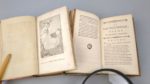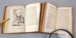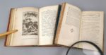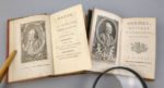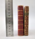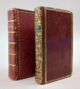 VOLTAIRE (François Marie Arouet de): Zadig, ou la Destinée, Histoire Orientale par Mr. de Voltaire. Londres, G. Sidney for Polidori, 1799. Un volume. 7 par 11,1 cm. Portrait-204 pages et 13 planches gravées hors-texte (complet). Plein maroquin rouge d'époque à grains longs, dos lisse orné de filets, plats encadrés d'une chainette dorée, filet sur coupe, dentelle intérieure, toutes tranches dorées, gardes marbrées. Infimes traces noires sur la reliure, quelques rousseurs dans le texte, principalement sur les gravures. Un bel exemplaire malgré tout. Première édition Polidori. Rare édition illustrée du roman philosophique de Voltaire, imprimée à Londres pour Gaetano Polidori (1764-1853), père de John William Polidori et grand-père de Dante Gabriel et Christina Rossetti. Il a traduit un certain nombre d'oeuvres en italien, notamment Le Château d'Otrante d'Horace Walpole et Le Paradis perdu de John Milton. Il publie de nombreux ouvrages, dont ceux de ses petits-enfants, et crée une presse privée dans sa maison de Londres. Le texte est accompagné d'une très jolie suite de treize planches et de deux vignettes dessinées et gravées par Le Coeur. On joint: VOLTAIRE (François Marie Arouet de): Poëmes, épitres et autres poésies. Genève, s.n., 1777. Un volume. 6 par 11 cm. (4)-portrait gravé-200 pages. Plein maroquin rouge d'époque, dos lisse orné, pièce de titre noire, plats avec un triple encadrement doré, filet sur coupe, dentelle intérieure, toutes tranches dorées. Petits frottements sur les plats, un coin émoussé. Très bon état intérieur. Un bel ensemble de deux oeuvres de VOLTAIRE en maroquin rouge d'époque, et petit format.