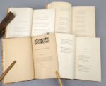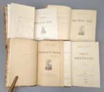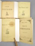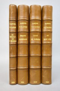 (AIN) Un ensemble de quatre ouvrages de Gabriel VICAIRE avec envois: VICAIRE (Gabriel): Choix de poésies. Paris, Librairie Théâtrale, 1903. Un volume. Couverture conservée. Avec une lettre autographe signée à «Cher compatriote…» VICAIRE (Gabriel): Emaux bressans. Paris, Charpentier , 1884. Couverture conservée datée de 1889. Avec un envoi autographe signé. Edition original en 1884. VICAIRE (Gabriel): Au bois joli. Paris, Lemerre, 1894. Couverture conservée, avec un envoi autographe signé. Edition originale. VICAIRE (Gabriel): Le miracle de St Nicolas. Paris, Lemerre, 1888. Couvertures conservées, avec un envoi autographe signé. Une tache sur la couverture conservée. Edition originale Les quatre ouvrages sont reliés de façon homogène: Demi basane tabac moderne, dos 5 nerfs, en très bon état. Un ensemble rare.