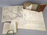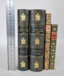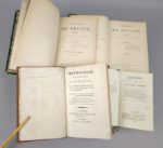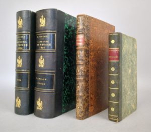 Important lot de 4 ouvrages sur la Prusse et les prussiens sous la Révolution et l'Empire: 1. Les PRUSSIENS dénoncés à l'Europe, par une Société de Témoins et de Victimes de leur invasion dans la Province de Hollande. Paris, Gueffier, 1789. Un volume. 12,5 par 20 cm. VIII-178 pages. Demi-basane mouchetée moderne, reliure pastiche. Rousseurs éparses, sinon très bon exemplaire. . Edition originale. Conlon 89 :5547 2. [BUCHHOLZ (P.-Fer.-Fr.)]: Galerie de caractères prussiens. Paris, Colnet, Fain, Debray, Mongie, Delaunay et Arthus Bertrand, 1808. Un volume. 9,5 par 16,5 cm. X-341 pages. Demi-basane vert empire de l'époque, dos orné, pièce de titre rouge. Reliure en très bon état, feuillets légèrement roussis. 2e édition (E.O. : 1808). L'auteur, professeur à l'Académie militaire de Brandebourg, était un grand admirateur de Napoléon. L'ouvrage parut anonymement en français ; c'est une suite de portraits de diverses personnalités prussiennes : militaires, savants, ministres, tracés d'une plume souvent acerbe. Cet ouvrage, également publié à Berlin, eut un retentissement très important en Prusse. 3. FOUCART (Paul): Campagne de Prusse (1806) d'après les Archives de la Guerre. Iéna. Avec deux cartes et trois croquis. Paris, Librairie Militaire Berger-Levrault et Cie, 1887. Un volume. 13 par 21 cm. XV-(1)-730 pp. + 2 cartes et 1 croquis repliés dans une pochette à la fin du volume. Demi-chagrin noir de l'époque, dos à nerfs orné de l'Aigle impériale. Reliure signée RUBAN. 2 croquis in-texte. Excellent état. Edition originale. 4. FOUCART (Paul): Campagne de Prusse (1806) d'après les Archives de la Guerre. Prenzlow - Lubeck. Avec trois croquis. Paris, Librairie Militaire Berger-Levrault et Cie, 1890. Un volume. 13 par 21 cm. de XXVI-960 pages + 3 cartes (croquis) sur 2 feuillets dépl. h.t. + 13 tableaux h.t. (dont 12 dépl.). Demi-chagrin noir de l'époque, dos à nerfs orné de l'Aigle impériale. Reliure signée RUBAN. Excellent état de la reliure. Petites déchirures sans manques sur la 2ème carte et le 1er tableau (sans manque ni gravité). Edition originale. Sans doute l'étude la plus complète sur la Campagne de Prusse de 1806, en deux volumes.