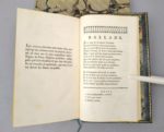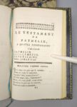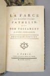 La Farce de Maître Pathelin, avec son Testament, à quatre personnages. Nouvelle édition. Paris, Durand, 1762. Un volume. 9,5 par 16 cm. 158 pages. Plein maroquin noir à grains longs, dos lisse richement orné , un filet doré encadrant les plats, roulette sur coupes, dentelle intérieure, dans son étui bordé. Reliure postérieure. Rares rousseurs claires, seul petit défaut de ce bel exemplaire. Les deux pièces de Maître Pathelin sont suivies par une ballade du 16ème siècle.