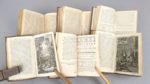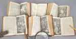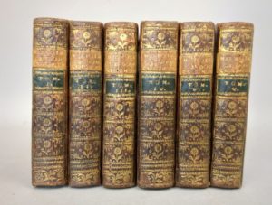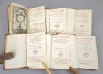 CERVANTES (Miguel de): Histoire de l'admirable Don Quichotte de la Manche, en VI volumes. Nouvelle édition revue, corrigée & augmentée. Francfort, en foire, J. F. Bassompierre, 1757. Six volumes. 8 par 13,5 cm. Titre gravé-(2)-XV-(5)-397; (4)-400-(3); (8)-403; (8)-488; (8)-451; (8)-452 pages. 32 gravures hors-texte (complet). Plein veau glacé d'époque, dos lisse orné, pièce de titre ocre, de tomaison noire, filet sur coupes. Une coupe usée sur 1 cm (sans gravité), deux petits trous de ver sur la reliure, un coin restauré anciennement avec discrétion. Papier parfois légèrement bruni, quelques rousseurs éparses. Charmante édition aux illustrations à la fois naïves et cruelles, dans un exemplaire très convenable.