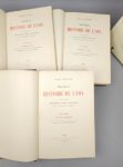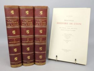 STEYERT (André) : Nouvelle histoire de Lyon et des provinces de lyonnais - forez - beaujolais, franc-lyonnais et Dombes. Lyon, Bernoux et Cumin, 1895-99. 3 volumes. 18,5 par 27,5 cm. Demi-maroquin à petits grains bordeaux à coins, 5 nerfs, caissons décorés aux armes de Lyon, roulette sur nerfs. Légère usure du papier sur les coupes, sinon très bel état de la reliure. Très bon état intérieur. Illustrée de 2253 dessins, cartes et plans, elle reste une des meilleures histoires de Lyon. On joint: STEYERT (André): Nouvelle histoire de Lyon et des provinces de lyonnais - forez - beaujolais, franc-lyonnais et Dombes. Tome Quatrième. Lyon, Pélardy, 1939. Broché, non coupé, à l'état de neuf. Ce 4ème tome, qui poursuit le travail de STEYERT jusqu'en 1899, est précieux pour sa table alphabétique générale.