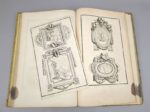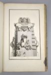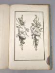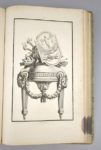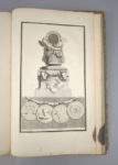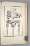 DELAFOSSE (Jean-Charles): Nouvelle iconologie historique ou attributs hiérogliphyques qui ont pour objets les quatre élémens, les quatre saisons, les quatre parties du monde et les différentes complexions de l'homme. Ces mêmes attributs peignent aussi les divers nations, leurs religions, les époques cronologiques de l'histoire. (…) Ces hiérogliphyques sont composés et arrangés de manière qu'ils peuvent servir à toutes sortes de décorations, fontaines, frontispices, pyramides, cartouches, dessus de portes, bordures, médaillons, trophées, vases, frises, lutrins, tombeaux, pendules, etc. Paris, chez l'auteur, rue Poissonnières, en la maison de m. menan, paveur, entre la rue de la lune et celle de beauregard et chez de Lalain, libraire, rue saint-jacques, 1768. Un volume. 32 par 49,5 cm. (44) pages, et 109 figures gravées en taille douce (pour 108 annoncées. Numérotation avec des doubles remplaçant des numéros absents). Complet. Demi-vélin d'époque muet. 4 feuillets de texte restaurés en marge anciennement. Une tache d'encre sur la quasi-totalité de l'ouvrage, en marge et sans atteinte aux planches. Quelques rousseurs éparses, mouillure claire sur les dix dernières planches, dont 5 en marge. La planche 75 a été découpée de sa page, mais est bien présente et complète. Edition originale de ce recueil très célèbre, réalisé par Jean-Charles Delafosse (1734-1789), architecte, ornemaniste et peintre français. Il fut un important théoricien du style Louis XVI "carré" et des débuts du néo-classicisme. Son style décoratif, exposé dans cet ouvrage, a inspiré de nombreuses demeures parisiennes à la fin du 18ème siècle. Livre rare, car souvent découpé.