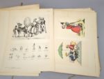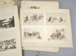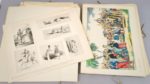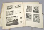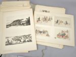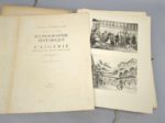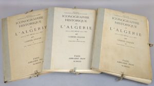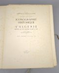 ESQUER (Gabriel): Iconographie historique de l'Algérie depuis le XVIe siècle jusqu'à 1871. 1830-1930 - Collection du centenaire de l'Algérie. Paris, Plon, 1929. Trois portfolios. 34 par 45,5 cm. (4)-XL-113 pages et 66 planches; (4) et 151 planches; (4) et 137 planches. Complet des 354 planches. Sous portfolios d'éditeur, demi percaline grise, avec 3 lacets. Bon état général, mais rousseurs sur les portfolios, sur les pages de texte, ayant épargné les gravures (sauf quelques-unes, en marge uniquement). Les planches rassemblent 1011 illustrations constituées par des peintures, dessins, estampes, images populaires, sculptures, médailles, représentant des portraits, vues de ville et vues du pays. Plus d'un millier de documents rassemblés par l'archiviste paléographe Gabriel Esquer (1876-1961), administrateur de la Bibliothèque nationale d'Alger. Précédé d'une étude sur l'iconographie historique algérienne, avec une notice sur les documents reproduits et des tables. L'essentiel de la publication est constitué par les OEuvres (peintures, dessins, estampes, images populaires, sculptures, médailles, etc.) que les événements ont inspirées, les portraits, les vues de ville et les aspects du pays. Les OEuvres reproduites ont été choisies non en raison de leur valeur artistique, mais du point de vue documentaire. La plus importante source iconographique relatant l'histoire de l'Algérie. Tome I: 16ème siècle - 1826 Tome II: 1827 à 1837 Tome III: 1838 à 1871.